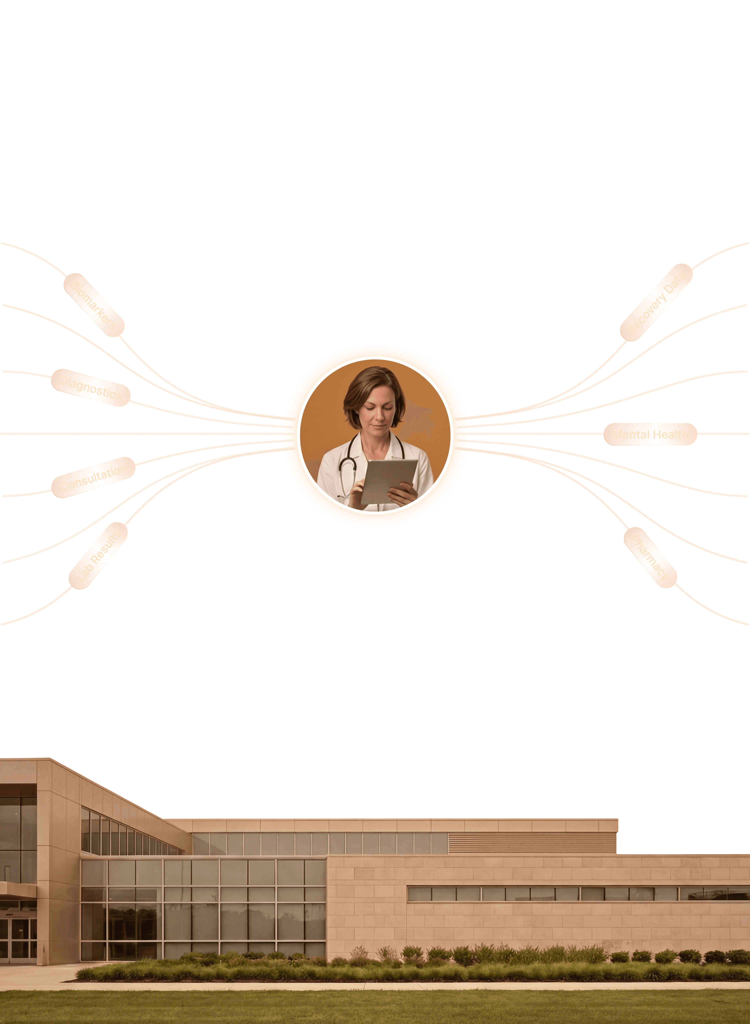 Integrates EMR data, lab results, imaging summaries, reports, and digital biomarkers into a longitudinal, patient-centric health profile, eliminating silos without replacing existing hospital systems.